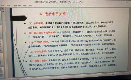 讲座的第三部分,宋老师讲解了战后第三次冲击下的日本嬗变与中日关系。第三次日本嬗变有外因和内因两个方面。主要是日本二战战败后,美国在日本主导推行的民主化改革奠定了战后日本的基本框架。另一方面,随着国力增强,日本逐渐开始追求成为“正常国家”,在对外关系中不时表现出右翼倾向。战后中日关系经历了五个阶段,战后初期中日关系得到纠正,冷战背景下的官方敌对与民间和解,邦交正常化后的蜜月期,九十年代合作与摩擦并存,以及新世纪后博弈与合作的时代。
